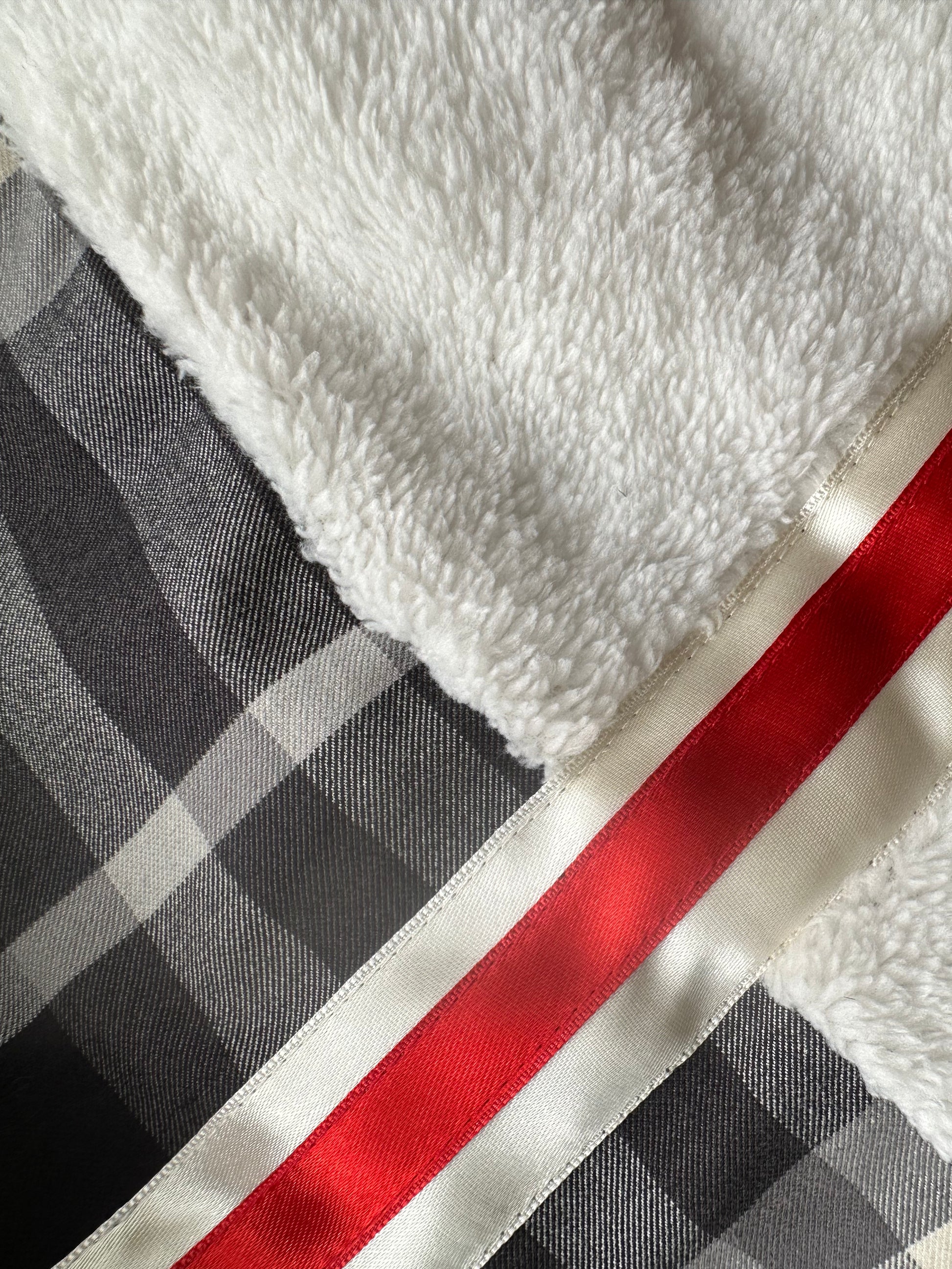 Veste kimono, manches en ausse fourrue blanche, bande de satin bicolore le long d'une manche. Carreaux noir gris et blanc.